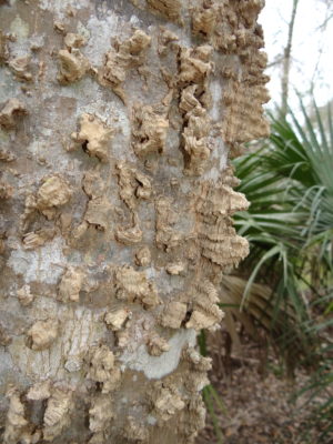 Celtis laevigata, commonly known as hackberry or sugarberry, is an easily overlooked small to large tree found in wet to mesic hammocks throughout Florida and much of the United States (Image 1). With an affinity for calcareous or high pH soils, sugarberry can also be found on aboriginal shell mounds. The discerning plant hunter can easily learn to identify these trees. One of the first things that often draws the eye is the bark. When the trees are young, the bark is covered in longitudinal corky protrusions that superficially remind one of a winged elm. With age, the ridges break up and turn into knobby protrusions (Image 2). No other tree in the Sarasota-Manatee area has bark that is quite this furrowed or knobby.