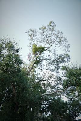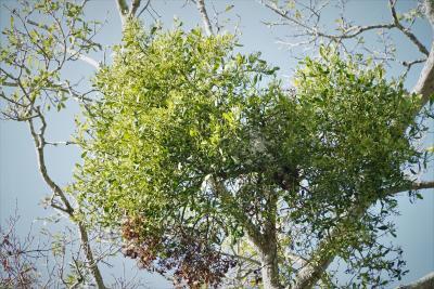 Mistletoe is commonly found in oak trees in Florida and is easiest to see during the winter months. As an evergreen plant, mistletoe is vibrant year-round, but when tree leaves fall in winter, you can easily see the ball-shaped masses on the bare branches. The plant spreads when birds eat the viscous white berries, and then spread the seeds onto other branches and trees in their droppings.