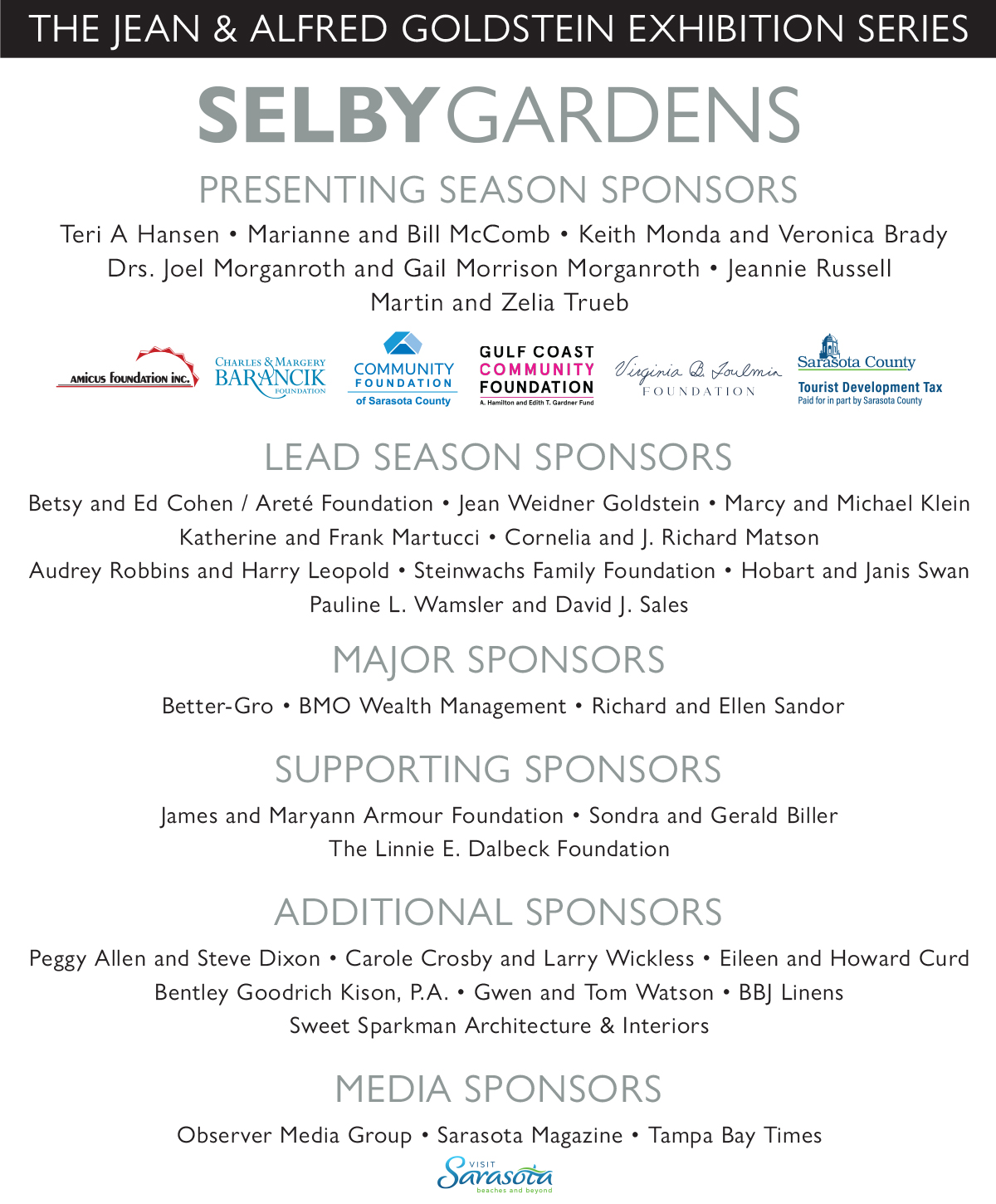 Exhibition Evenings build a deeper understanding of our spring art exhibition. The event includes a reception with light hors’devours and beverages from Michael’s on East and performance by a leading Sarasota performing arts organization on the terrace or inside of the Selby Gardens Event Center.