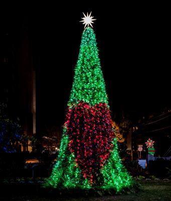 This year, the Bromeliad tree features five different bromeliad varieties. It was constructed with more than 600 Bromeliads by the Selby Gardens’ horticulture team, and then decked in red and green lights for Lights in Bloom.